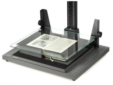 Haltevorrichtung mit Glas-Andruckplatte zum exakten Positionieren beim Reproduzieren aus Büchern, Zeitschriften und Zeitungen.