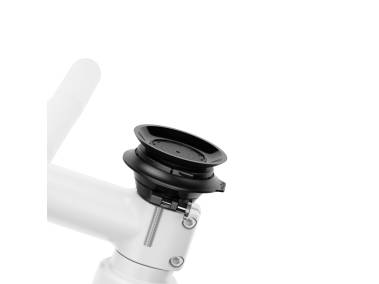 Die Vorbaukappen-Halterung besteht aus einer speziellen Ahead Kappe, die am Steuerrohr verschraubt wird. Die base wird anschließend auf die Cap gesteckt und ganz einfach mit einer Klemmschelle mit Hilfe einer Rändelschraube, oder diebstahlsicher mit einer Innensechskantschraube, sicher befestigt. Die ahead cap base kann so ganz schnell abmontiert werden, wenn kein Smartphone benötigt wird, während die schlichte Kappe am Rad verschraubt bleibt.