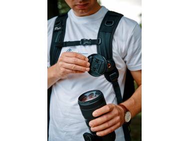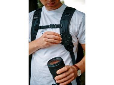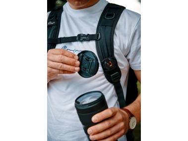 Zuverlässiges Equipment für mehr Konzentration auf das richtige Motiv: Der SNAPSNAP lens cap clip bietet eine schnurlose Befestigung des Objektivdeckels am Schultergurt des Rucksacks oder am Gurt der Kameratasche. Bei dem patentierten System wird die magnet-mechanische Halterung am Schultergurt befestigt und das passende Gegenstück auf den Objektivdeckel geklebt. So hat der Objektivdeckel eine feste und sichere Position und bleibt stets griffbereit. Der Verschluss löst sich automatisch, sobald der Objektivdeckel gerade nach oben angehoben wird.