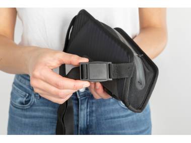 - Verstaubarer und größenverstellbarer Gurt zum Tragen über die Schulter