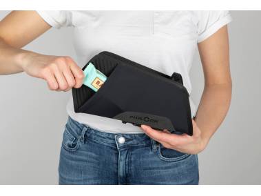 - Verstaubarer und größenverstellbarer Gurt zum Tragen über die Schulter