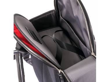 Zwei separate Innenfächer für ein 14“- Laptop (mit Magnetverschluss und zusätzlicher Polsterung) und für Dokumente bis DIN A4. Große Außentasche mit feinem Lederriemenverschluss und Organizer-Einteilung für Stifte, Karten Akkus, Kabel, Schlüssel, etc. Zusätzlicher Stauraum in den beiden seitlichen Einstecktaschen. Rückenauflage und längenverstellbare Lederschulterriemen mit hochwertiger Polsterung und Netzbezug für hohen Tragekomfort. Tragegriff aus Leder. Set mit zusätzlichen roten Reißverschluss-Schlaufen.