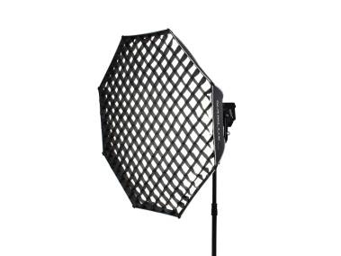 Für die Erzielung von gerichtetem Licht und zur Verminderung von Streulicht kann eine im Lieferumfang enthaltene Stoffwabe befestigt werden.