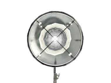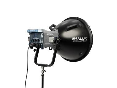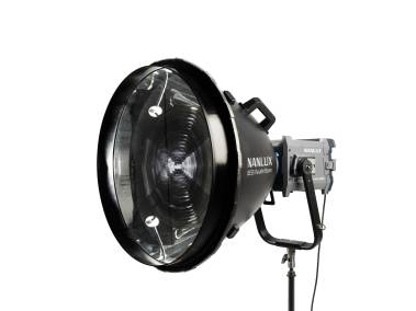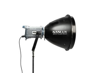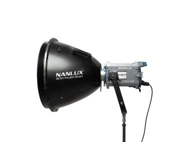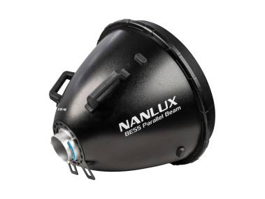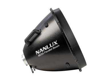 Parallel-Beam-Reflektor mit BE-Bajonett (wie Bowens-Bajonett, aber zusätzlich mit elektronischen Kontakten), für Scheinwerfer mit BE-Bajonettanschluss, wie z. B. NANLUX Evoke 600C sowie bestimmte Scheinwerfer mit Bowens-Bajonettanschluss. Nicht geeignet für Scheinwerfer > 800 W und NANLITE Forza 720/720B.