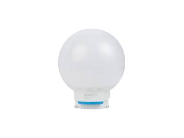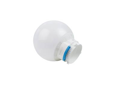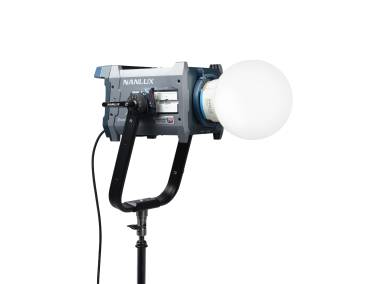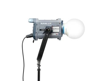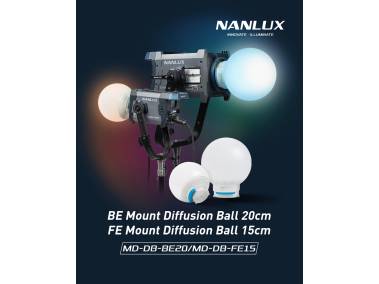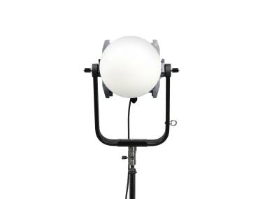 Kugelförmiger Leuchtenvorsatz mit BE-Bajonett (wie Bowens-Bajonett, aber zusätzlich mit elektronischen Kontakten), für Scheinwerfer mit BE-Bajonettanschluss, wie z. B. NANLUX Evoke 600C sowie bestimmte Scheinwerfer mit Bowens-Bajonettanschluss. Nicht geeignet für Scheinwerfer > 600 W und Scheinwerfer der NANLITE FC-Serie.