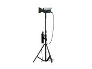 Lieferumfang: Scheinwerfer, Reflektor, Netzteil, Netzkabel (6 m), Verbindungskabel (3 m), Stativklammer und Tragekoffer.