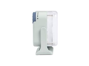 Aufstellbügel mit 12 Rastungen zum Ausrichten der Leuchte in 30°-Schritten. Mit magnetischer Unterseite zum Fixieren der Leuchte an magnetischen Oberflächen sowie 1/4"-Anschlussgewinde zum Befestigen der Leuchte auf geeigneten Stativen und Halterungen.