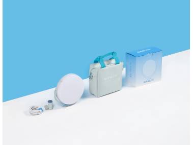 Lieferumfang: Runde Flächenleuchte mit Montagebügel und Diffusor, USB-C-Kabel, Befestigungshülse und Transporttasche.