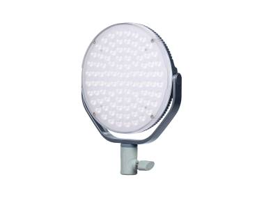 Runde, multifunktionale Full-Color-Flächenleuchte mit modernem Design, leicht und kompakt, mit flachem Kunststoffgehäuse und Montagebügel. Im Gegensatz zu typischen rechteckigen Flächenleuchten erzeugt die runde Form natürliche Lichtreflexe in den Augen für Porträts, Interviews und Social-Media-Aktivitäten.