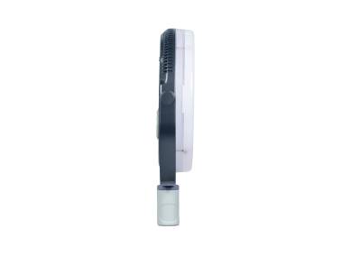 Rundes, flaches Kunststoffgehäuse mit 16,7 cm Durchmesser, mit Aufnahmefach für einen NP-F-Akku bzw. die optionale Powerbank-Halterung.