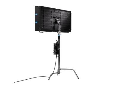 Akkubetrieb für den mobilen Einsatz mit einem oder zwei V-Mount-Akkus (14,4 – 14,8 V, 26 V oder 28,8 V, optionales Zubehör). Befestigung an der Steuereinheit. Maximale Helligkeit