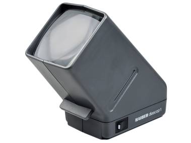 Slide viewer with 2x magnifying lens for framed slides, 5 x 5 cm (2 x 2 in.), and uncut film strips in protective sleeves.
