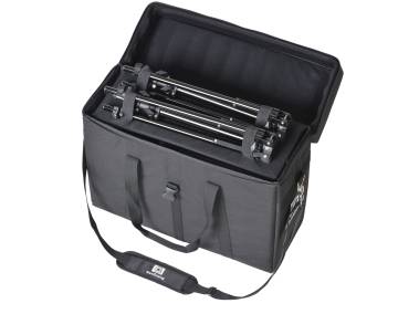 each with 900 LEDs (CRI ≥ 95, TLCI = 93), control dial for color temperature (3200 up to 5600 Kelvin) and dimmer, built-in radio receiver, swiveling mounting bracket, four large barn doors, mains adapter and mains adapter support, diffusor screen, soft screen, blue filter and case for two screens