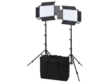 each with 1152 LEDs (CRI ≥ 95, TLCI = 93), control dial for color temperature (3200 up to 5600 Kelvin) and dimmer, built-in radio receiver, swiveling mounting bracket, four large barn doors, mains adapter and mains adapter support, diffusor screen, soft screen, blue filter and case for two screens