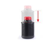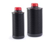 For photochemicals. Black. The accordion-like walls can be pressed together, setting excess air free. This reduces the danger of oxidation and allows for longer storage of chemicals. With screw-on cap.