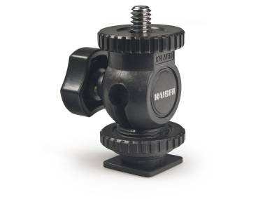 Tilts continuously up to 90° and rotates up to 360°. Central locking screw. Connection thread 1/4". Mounts on the accessory shoe or a tripod. Tripod thread 1/4". Lock rings for secure hold.