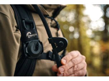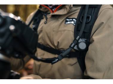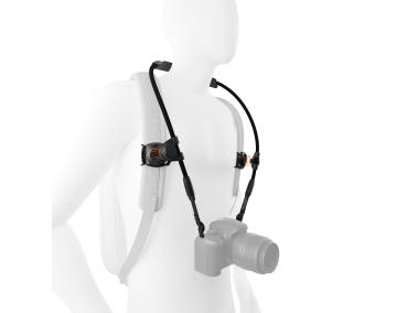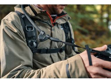 Reliable equipment for more concentration for the perfect shot: the SNAPSNAP camera strap provides more balance and comfort when taking photos. With the patented system, magnetic-mechanical mounts on the camera strap connect to matching counterparts on the backpack. This distributes the weight of the camera onto the shoulder straps, relieving the neck. The camera sits closer to the body and swinging is significantly minimised. The fasteners release automatically as soon as the camera is lifted straight up to take a photo.