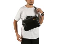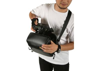 Sling-type camera bag with an external design that blends in with the urban setting, and functionality focused on ease of taking out the camera and comfort when carried on the user’s back, for taking