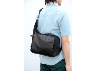 Light, water-repellent nylon is used in combination with steer for the front pocket as a stylish accent.